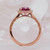 14 KT rose gold lady's pink sapphire halo diamond halo design ring with 1.27 carats round pink sapphire in the middle and .19 carats round diamonds on the sides. Diamonds are F to G in color and VS to SI in clarity.